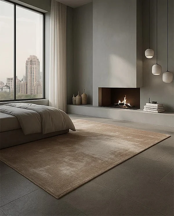 В спалнята килимът създава рамка около леглото и подсилва усещането за уют. Може да бъде поставен под цялото легло или частично – само в долната част.