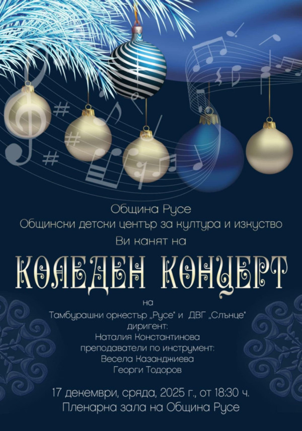 На 17 декември, сряда, от 18:30 часа в Пленарната зала на Община Русе е коледният концерт на Детската вокална група „Слънце" и Тамбурашкия оркестър „Русе" с диригент Наталия Константинова и преподаватели по тамбура Весела Казанджиева и Георги Тодоров. Входът за концерта е свободен.