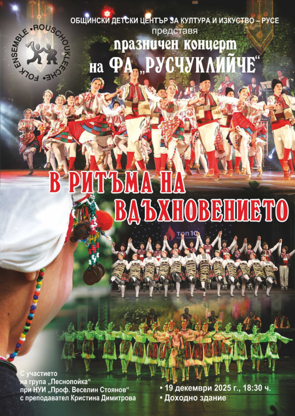 Фолклорният ансамбъл „Русчуклийче" също ще поздрави русенци за Коледа с концерт на 19 декември, петък, от 18:30 часа в Голямата зала на Доходно здание. Входът за това събитие е с билети, които могат да бъдат закупени на 18 и 19 декември на касата на Доходно здание от 10 до 17 часа.