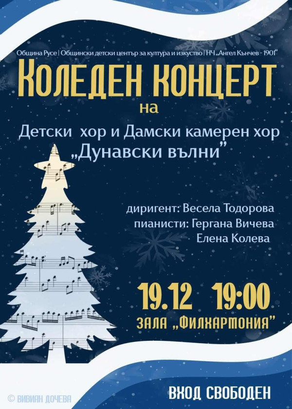 На 19 декември от 19 часа в зала „Филхармония“ ще се състои Коледен концерт на Детския хор „Дунавски вълни" и Дамския хор „Дунавски вълни" при НЧ „Ангел Кънчев – 1901" с диригент Весела Тодорова. На рояла ще акомпанират Гергана Вичева и Елена Колева. Входът е свободен.