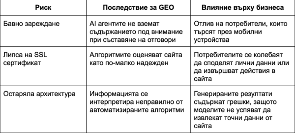 Когато структурата на сайта е остаряла или данните са неясно поднесени, генеративните модели не могат да извлекат стойностна информация. Това води до липса на присъствие в AI резултатите, независимо от качеството на самото съдържание. Именно затова GEO се превръща в основен компонент на модерния дигитален маркетинг.