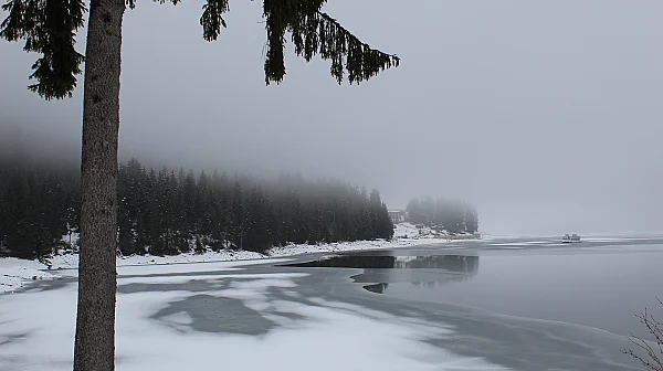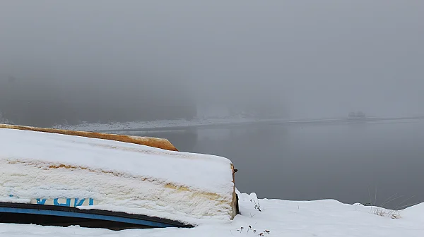 Пътят беше изненадващо добре поддържан – почистен, опесъчен, въпреки снега. Това ни учуди. Навсякъде наоколо бялото беше дълбоко, но асфалтът беше проходим. Бяхме сами. Нямаше коли, нямаше хора, само ние, кучето и мъглата. После, бавно, сякаш по уговорка, тя започна да се вдига. Слънцето се показа, първо плахо, после уверено, и язовирът се разкри – частично замръзнал, със сребриста повърхност и тъмни петна вода, в които плуваха патици.