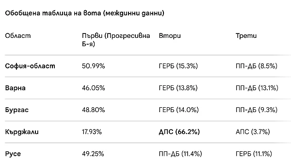 Екипът на ФрогНюз отбелязва: Данните продължават да постъпват, но тенденцията е ясна – електоралната карта на България е преначертана. Единствено в смесените райони ДПС запазва лидерството си, докато в останалата част на страната традиционните партии губят позиции.