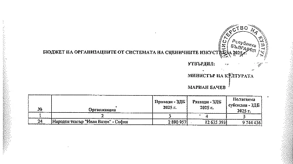 Според официалните данни, предоставени на ФрогНюз, утвърденият бюджет на Народния театър за 2025 г. възлиза на общо 12 635 395 лв. (от които 2 890 957 лв. собствени приходи и 9 744 438 лв. държавна субсидия). В същото време отчетените разходи са в размер на 12 635 793 лв. Числата показват символичен превес на разходите, но министерството е категорично в отговора си до медията ни: към 31 декември 2025 г. театърът няма никакви задължения.