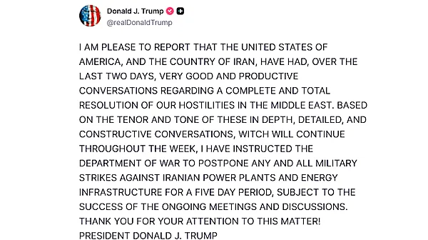Президентът на САЩ Доналд Тръмп обяви, че е разпоредил временно отлагане на планирани военни удари срещу енергийна инфраструктура в Иран. В публикация в социалната мрежа Truth Social той съобщи, че атаките срещу електроцентрали и други ключови обекти ще бъдат спрени за петдневен период. Решението е обвързано с напредъка на текущите разговори между Вашингтон и Техеран.